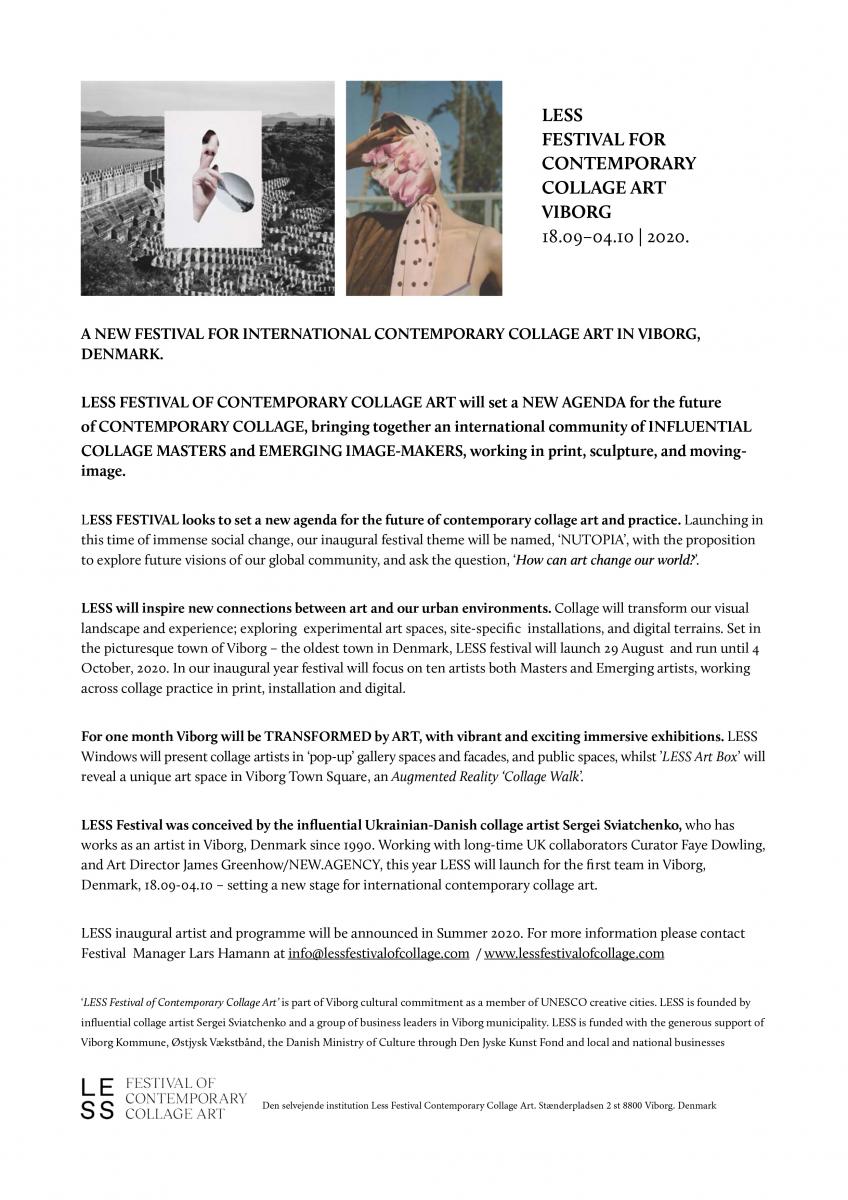 Перший міжнародний фестиваль сучасного коллажного мистецтва LESS є частиною культурного розвитку Виборга, одного з з найдавніших міст Данії, члена творчих міст ЮНЕСКО. LESS фестиваль заснований знаменитим і впливовим художником-коллажіст Сергієм Святченко і групою лідерів бізнесу в муніципалітеті Виборг. LESS фінансується і підтримується Viborg Kommune, Ostjysk Vækstbånd, Міністерством культури Данії через фонд Den Jyske Kunst, а також локальними і національними підприємствами.
